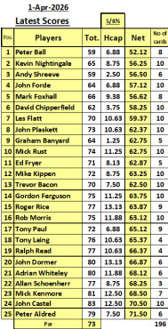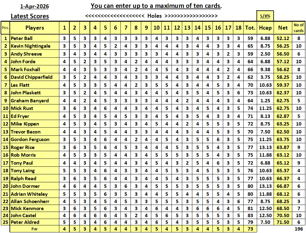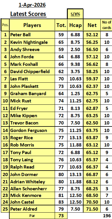 25 players and 198 cards for this year's eclectic. Peter Ball is the winner with an excellent gross of 59 ( mmatched by Andy Shreeve) and a net 52.12.