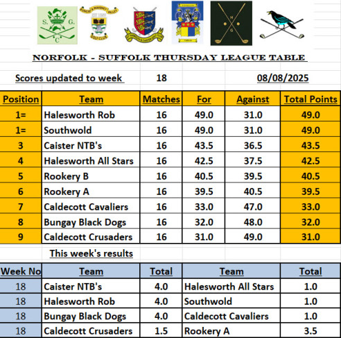 Every Thursday evening, first tee off at 16.30, from the 10th April to the 7th August 2025 there are matches against Caister, Rookery (two teams), Halesworth (two teams), Southwold and Bungay. Caldecott are also running two teams, one run by the men's captain and one run by the mens vice-captain.
